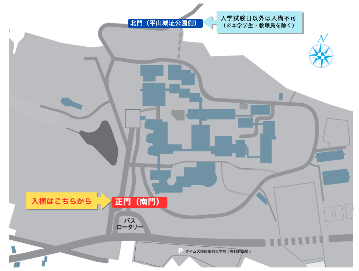 ※入構にあたっては、東京薬科大学バスロータリーのある正門(南門)から入構してください。
