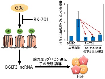 次に、RK-701を用いて、G9aによる胎児型γグロビン遺伝子の発現抑制機構を調べました。RK-701により発現が増加する遺伝子を網羅的に調べたところ、数ある胎児型γグロビン発現制御因子の中で、BGLT3遺伝子の発現だけが非常に増加していることが分かりました。BGLT3は、胎児型γグロビン発現誘導活性を持つ長鎖ノンコーディングRNA(IncRNA)です。細胞内のBGLT3(BGLT3 lncRNA)の発現を低下させると、RK-701による胎児型γグロビンの発現誘導がほぼ完全に抑制されました(図2右上)。これらの結果から、G9aによる胎児型γグロビン遺伝子の発現抑制にBGLT3が重要な役割を果たしていることが分かりました(図2)。
