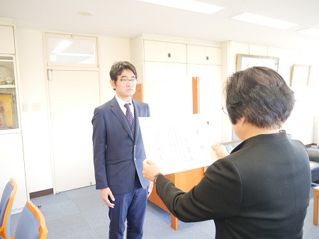 新型コロナウイルス感染症(COVID-19)の感染拡大防止の観点から、令和元年度「水島昭二記念研究賞」授賞式・受賞記念講演会は中止となりましたが、授賞式に代えて、2020年3月6日(金)、理事長室におきまして、選考委員会委員長である平塚学長による審査報告の後、楠理事長より賞状及び副賞が受賞者に授与されました。