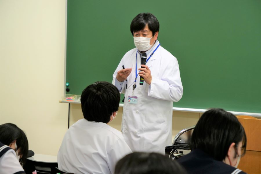 薬学部では、堀 祐輔教授が薬学部卒業後の多様な就職先や仕事の魅力を紹介するとともに、薬剤師から大学教員へと進んだ堀教授自身のキャリアについてもお話しました。続いて、堀教授の案内で薬学部4年生の事前実務実習の様子や実習用の生体シミュレーターなどを見学しました。