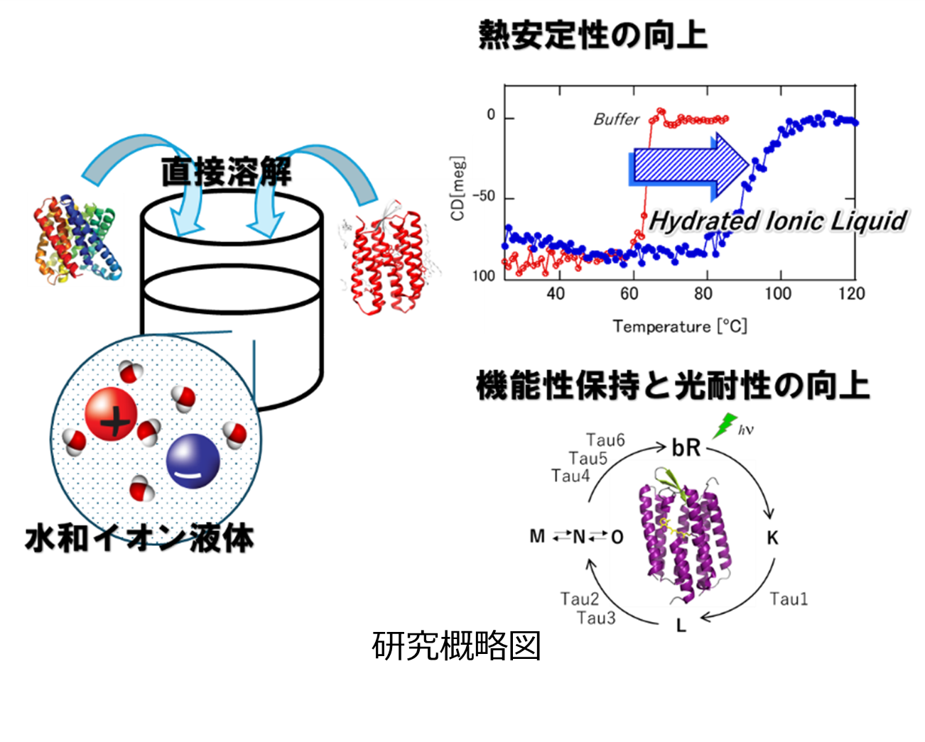 本研究では、液体の塩である“イオン液体*3”にわずかな水を含ませた「水和イオン液体(Hydrated Ionic Liquids)*4」を用いることで、膜貫通型タンパク質*5(TehA*6およびバクテリオロドプシン*7)を直接溶解するだけで、構造と機能を保持した安定化に成功しました。